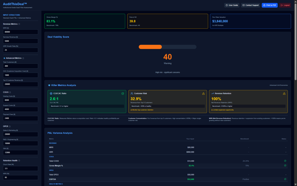 AuditThisDeal™ is a secure, institutional-grade web application that transforms 15 years of banking credit risk methodology into a tool specifically designed for Micro-SaaS acquisitions.